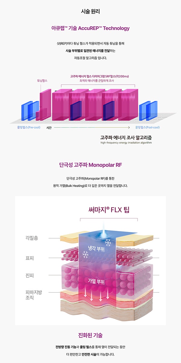 ½á¸¶Áö FLX(Thermage)´Â °íÁÖÆÄ(RF) ¿¡³ÊÁö¸¦ ÇǺΠÁøÇÇÃþ¿¡ Àü´ÞÇØ ³ëÈ­µÈ Äݶó°ÕÀ» ¼öÃà½ÃŰ°í »õ·Î¿î Äݶó°Õ »ý¼ºÀ» À¯µµÇÕ´Ï´Ù. ÇǺΠǥ¸éÀ» Á¶¿©ÁÖ´Â 'ŸÀÌÆ®´×' È¿°ú°¡ Ź¿ùÇÏ¿© ÀÜÁÖ¸§°ú ÇÇºÎ°á °³¼±¿¡ µ¶º¸ÀûÀÔ´Ï´Ù.